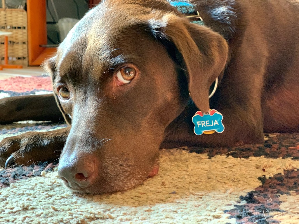 First, I picture someone who is easy to love, like our nearly 14-year old chocolate lab, Freja. May you be well. May you be happy. May you be free from suffering.